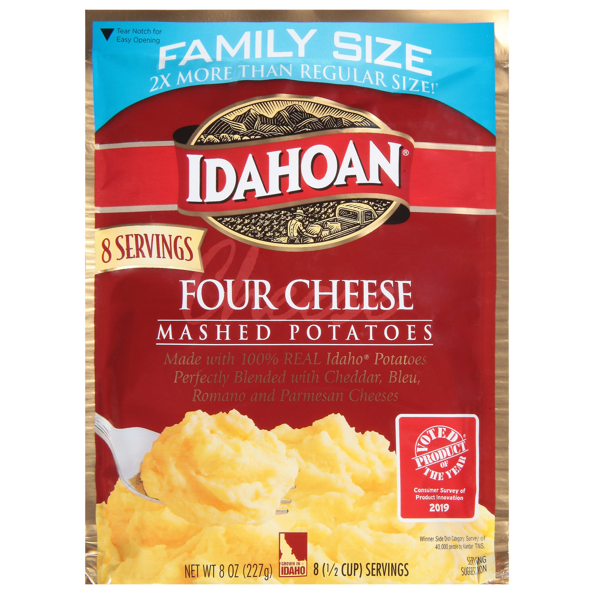 Made with 100% real Idaho potatoes perfectly blended with cheddar, bleu, Romano & parmesan cheeses. 2x more than regular size (Compared to 4 oz pouch of Idahoan Four Cheese Mashed Potatoes)! 8 servings per pouch. Homemade taste every time.