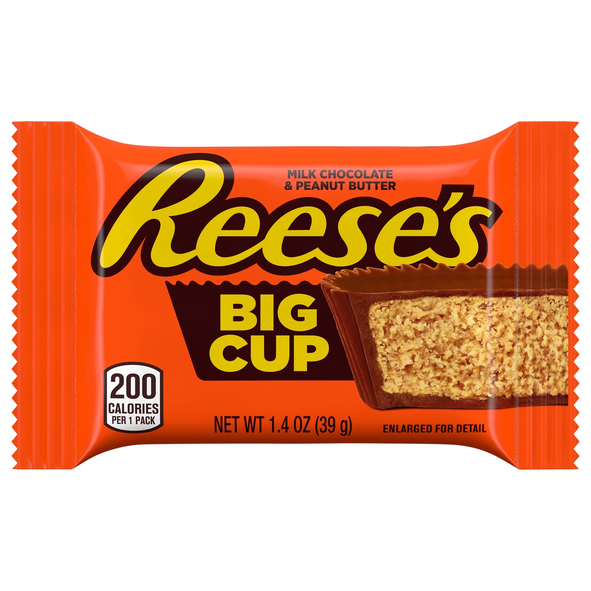 Name a more iconic duo. Everyone will wait... You can't beat the old-fashioned, match made in heaven when it comes to creamy milk chocolate combined with delicious peanut butter. Get ready to taste perfection! REESE'S Big Cups milk chocolate peanut butter packs are your go-to snack. Bring a few packs along to the next sporting event, party, movie marathon, game night and so many other activities for an extra bite of peanut butter goodness. Store them in your pantry to slip into lunch boxes and purses for a midday surprise. These big peanut butter cups candies are a sweet delight that you can bite, break, dunk or nibble on. Yes! Dunk them into a cold glass of milk, a cup of hot chocolate or in your coffee to experience the melty goodness. Put a unique twist on cookies, cupcakes and ice cream decadents with whole, halved or broken REESE'S cups. They are a gluten-free kosher product that goes well with almost everything, especially during your holiday celebrations. Add them Christmas stockings, Halloween candy bowls, Valentine's Day gift bags and Easter baskets.