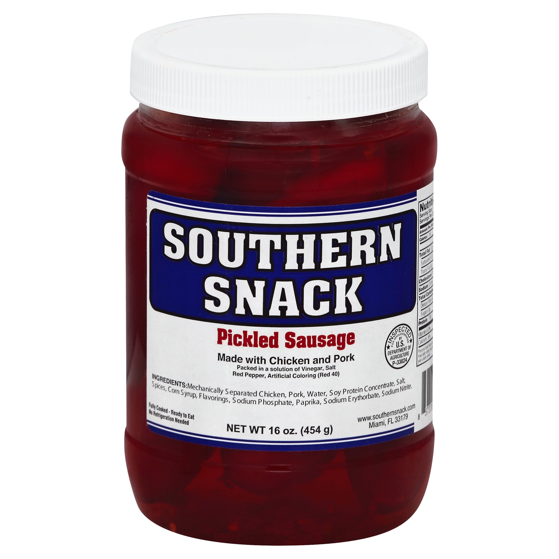 Made with chicken and pork. Packed in a solution of vinegar, salt, red pepper, artificial coloring (red 40). Inspected for wholesomeness by US Department of Agriculture. Fully cooked - ready to eat. No refrigeration needed. www.southernsnack.com.